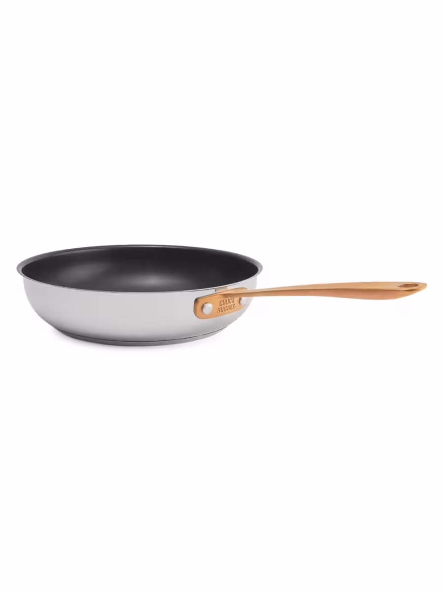 - Riveted ergonomic stainless steel handles with a gold brush finish