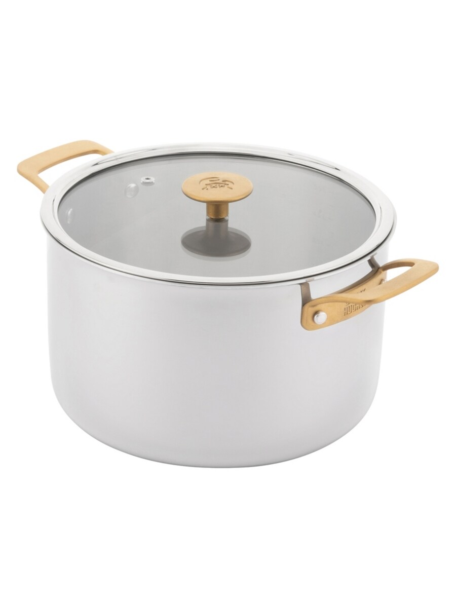 - Stainless steel interior and exterior with thick aluminum core throughout for quick and even heat distribution