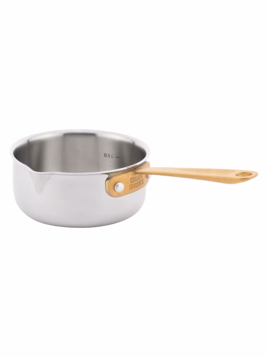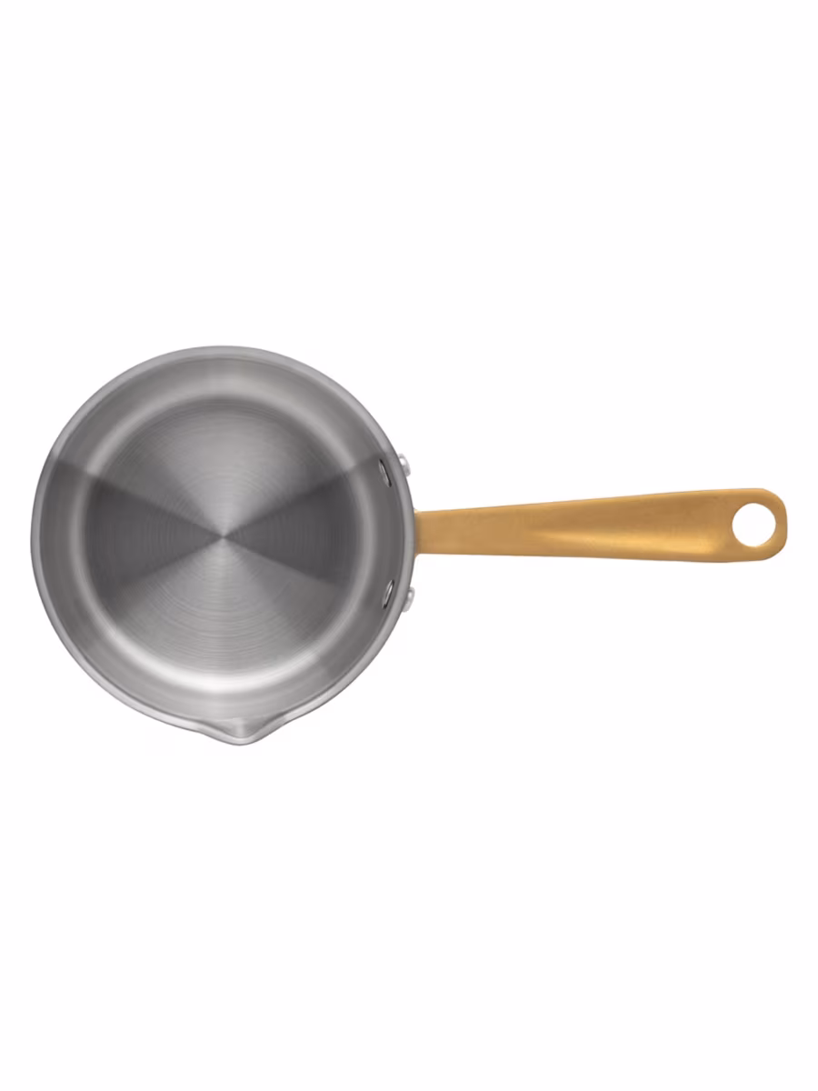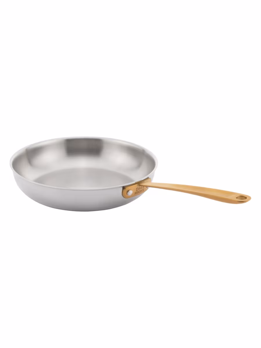 - Riveted, ergonomic stainless steel handles rough brush gold finish