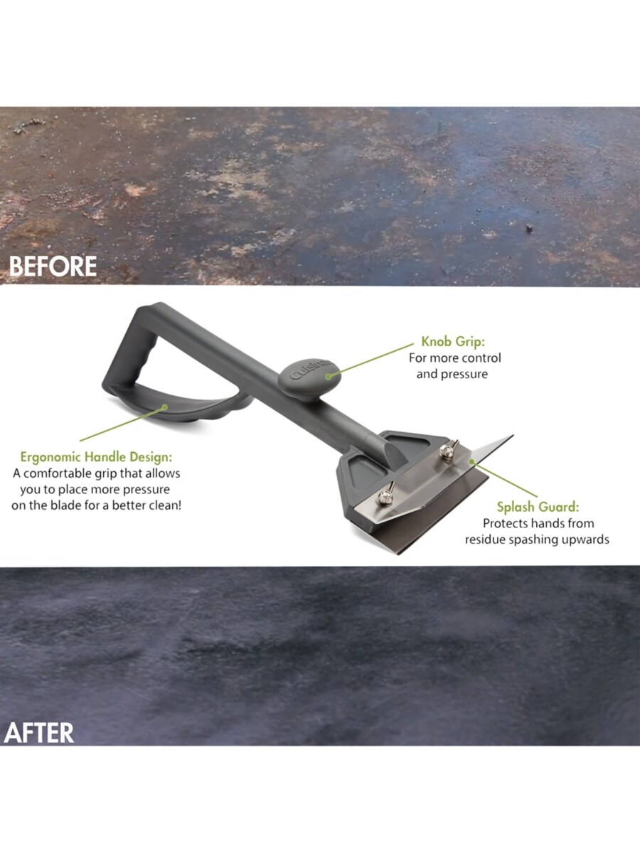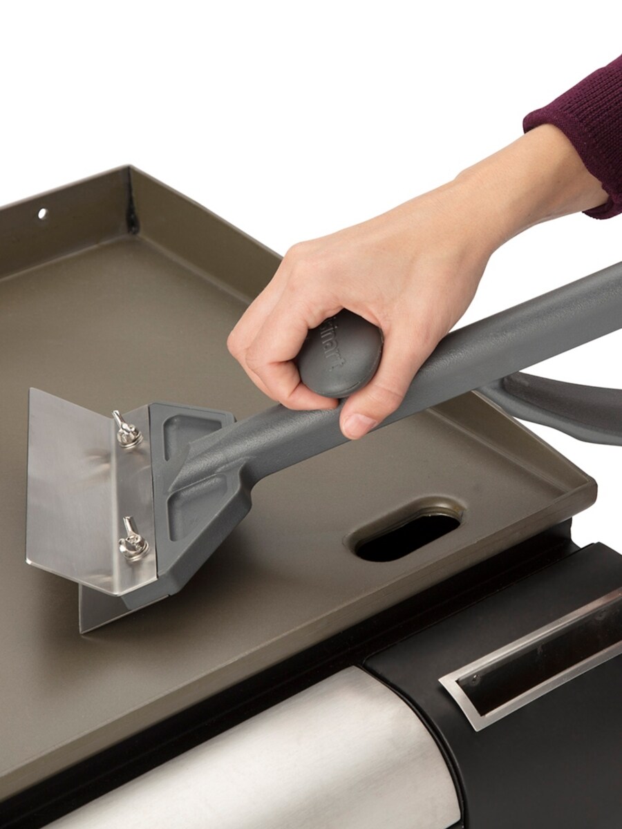 Easily remove burnt, caked-on residue from your griddle with the Cuisinart heavy duty griddle scraper. The ergonomic design has an easy grip handle, allowing you to place more pressure on the stainless steel blade for a better clean.