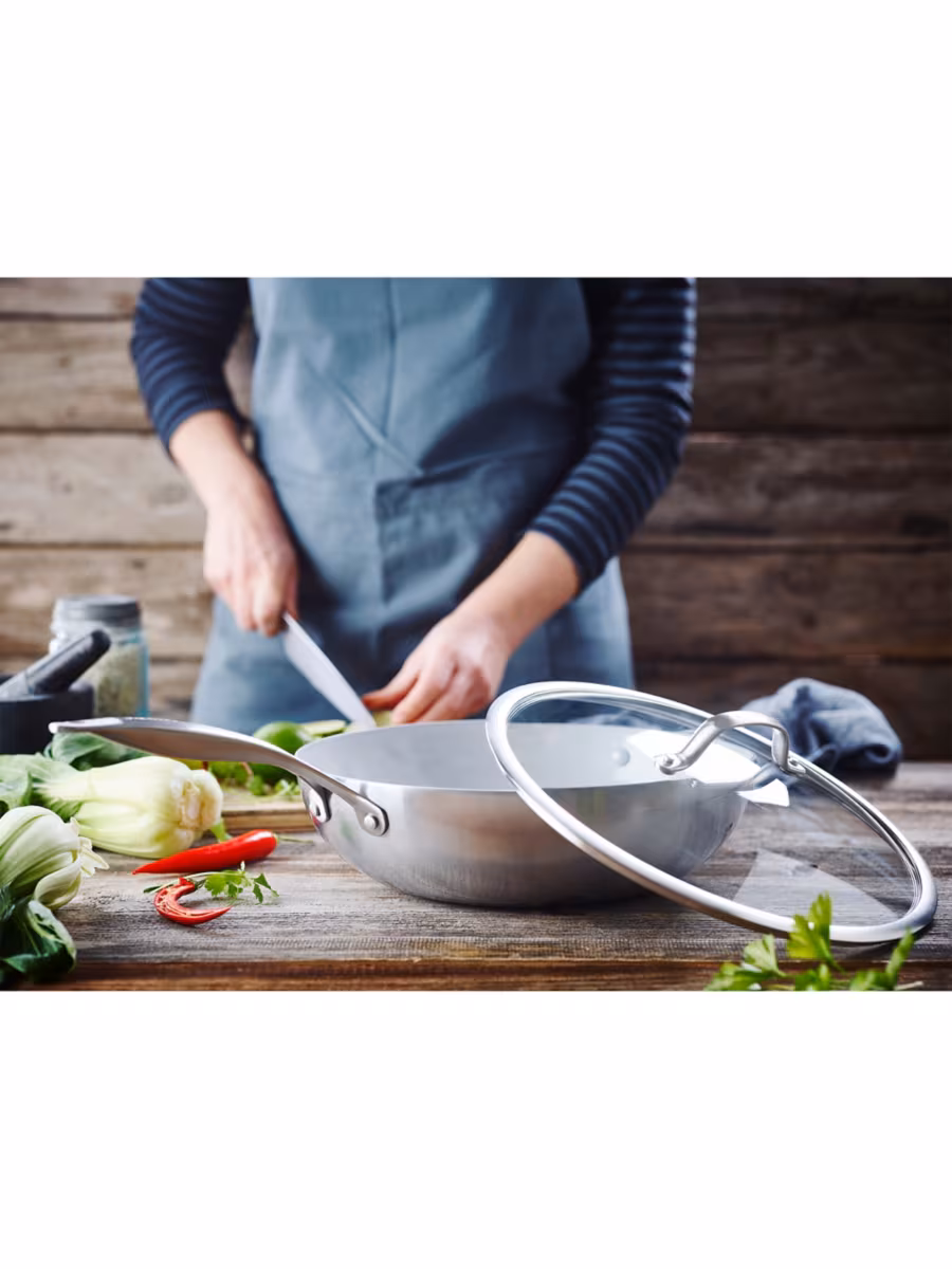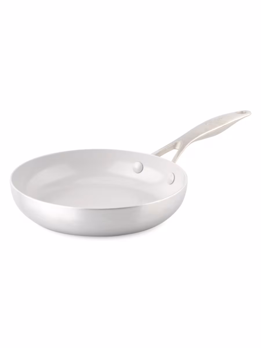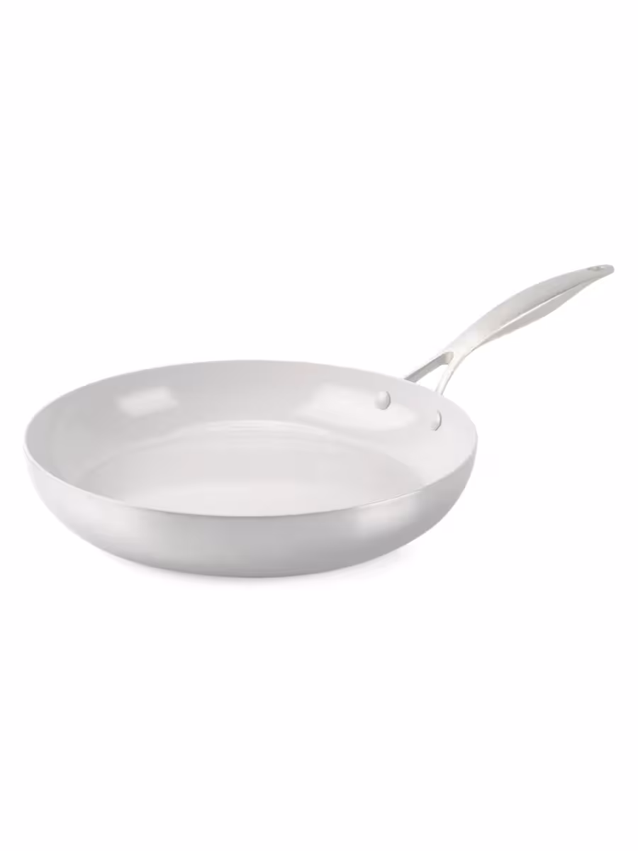 The Venice Pro Collection is painless stainless—an incredible blend of nonstick ease and gorgeous stainless steel style. This collection’s metal utensil-safe Thermolon Minerals Pro ceramic nonstick coating is infused with diamonds for remarkable durability, balanced heating, and effortless cleanup. Thermolon can do what other nonstick coatings can’t—that means easy searing, braising, and deglazing without worrying about a mess. The three-ply stainless steel body features Evershine, a unique finish that helps to prevent discoloration and keeps your pan looking like new longer. The matte-finished, riveted stainless steel handle let you go from stovetop to oven with ease. This frypan wipes clean, but it's dishwasher safe for big messes.