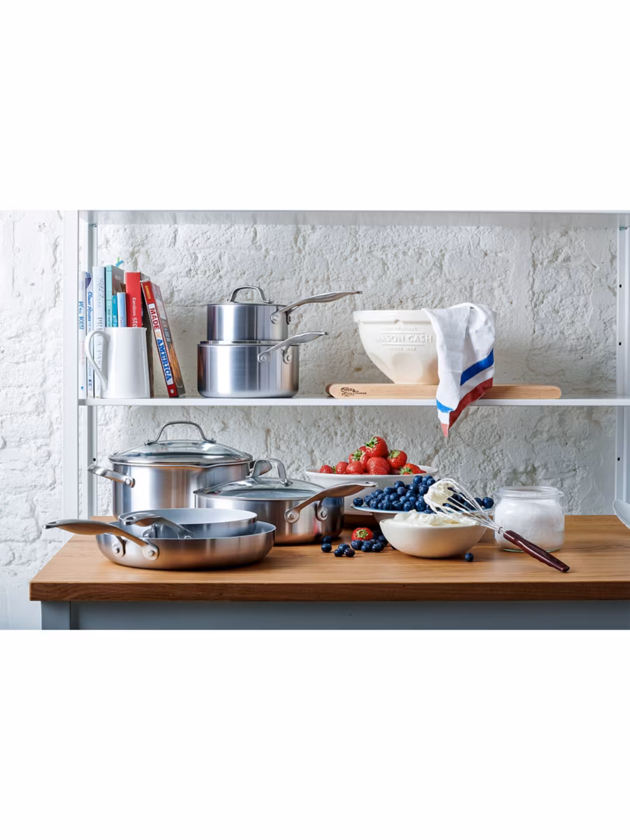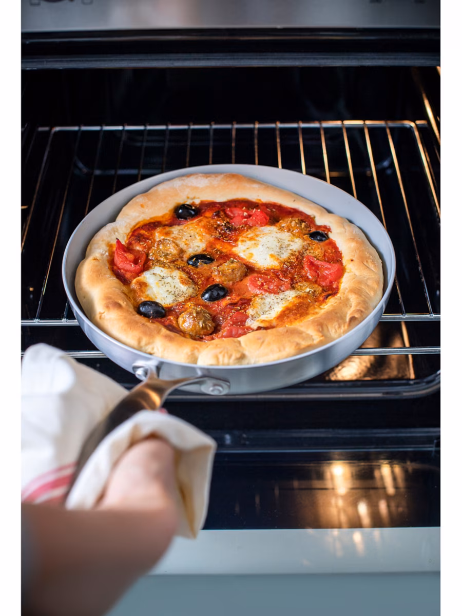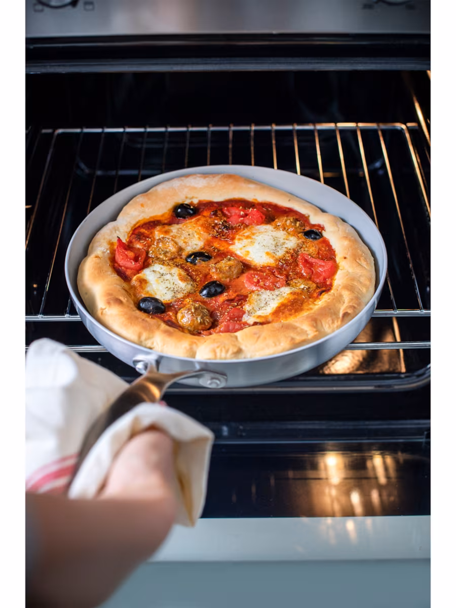 - Riveted stainless steel handle for easy transition from stovetop to oven.