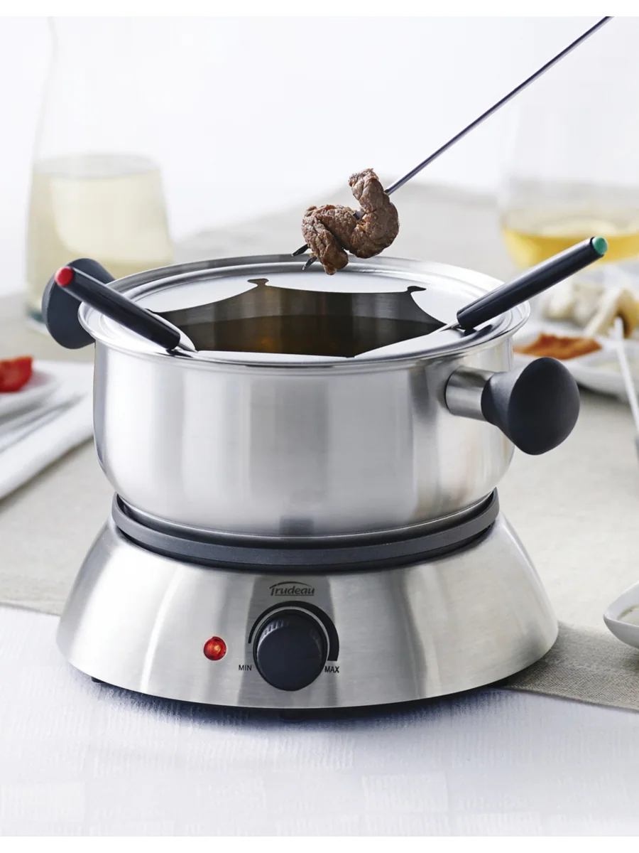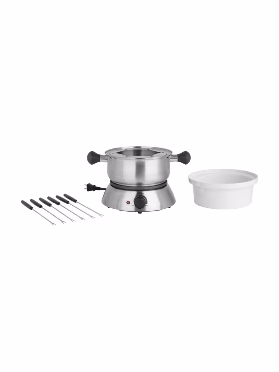 - Includes: 6 colour coded fondue forks, electric base with thermostat control, 77 ounce handled pot