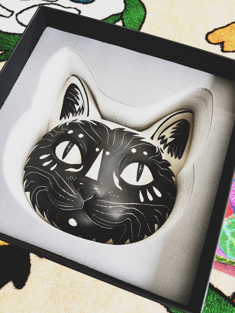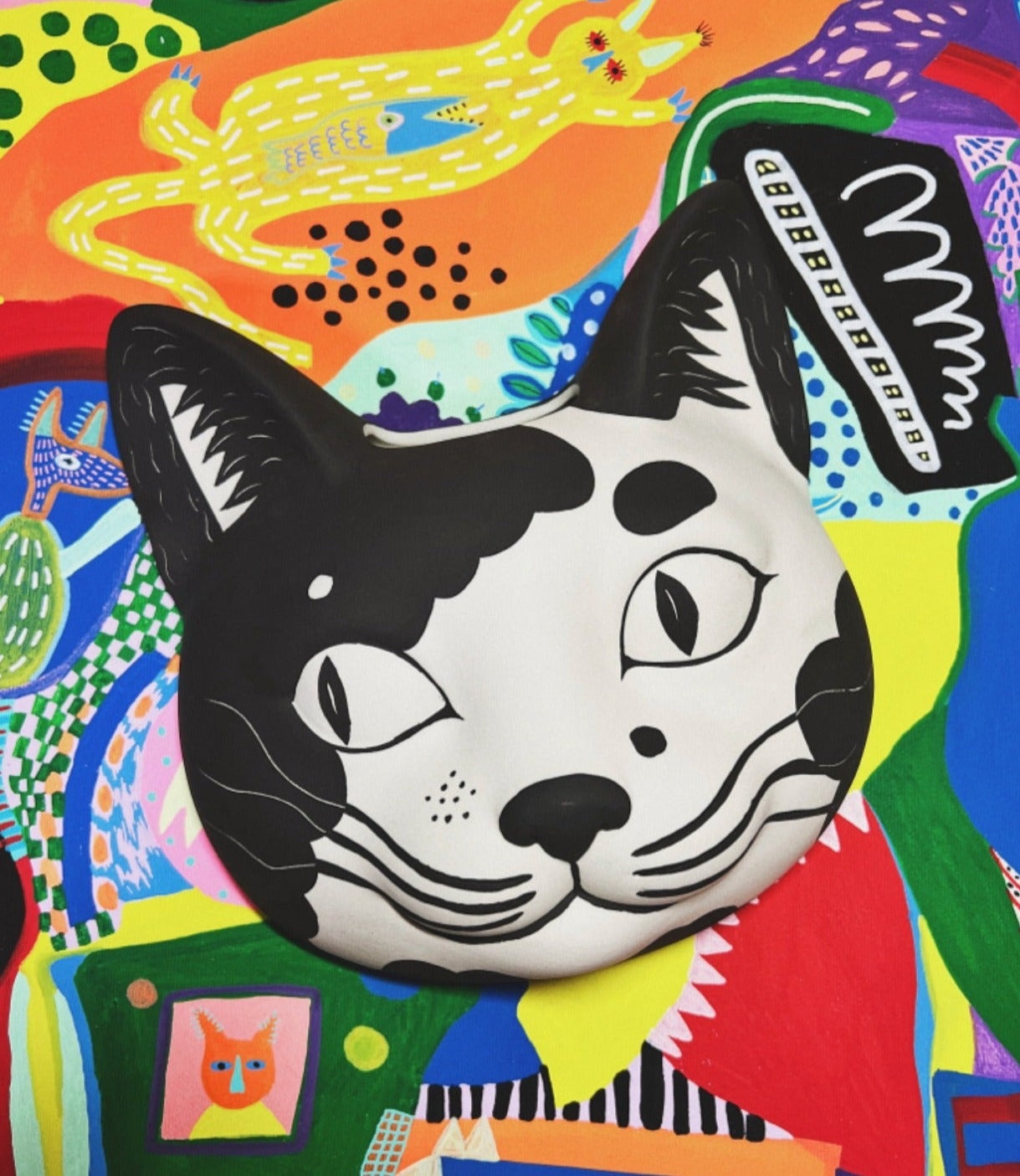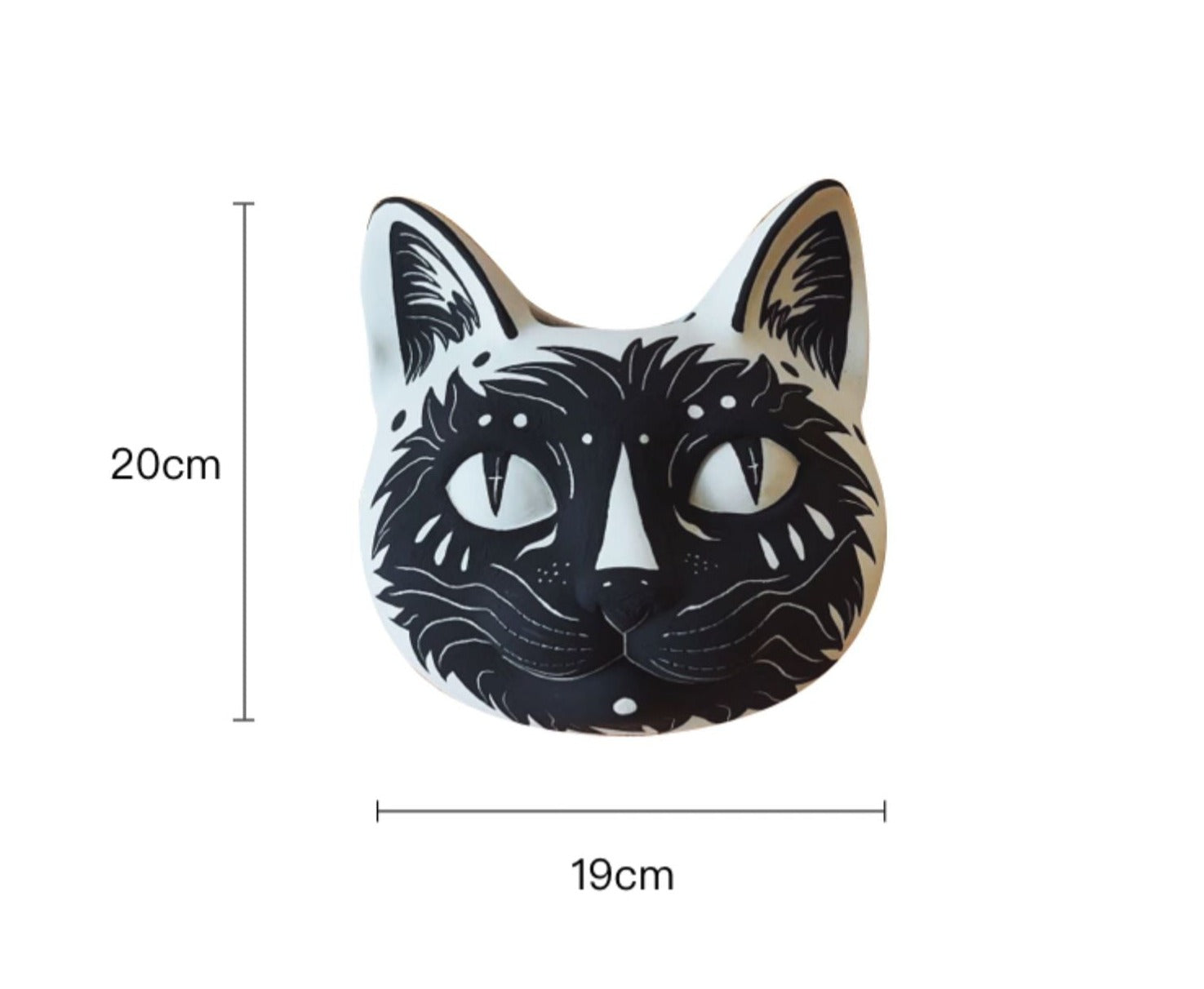 Ceramic hanging vase in cat head sculpted shape, black ink hand painted by artist