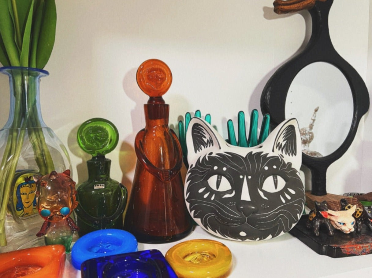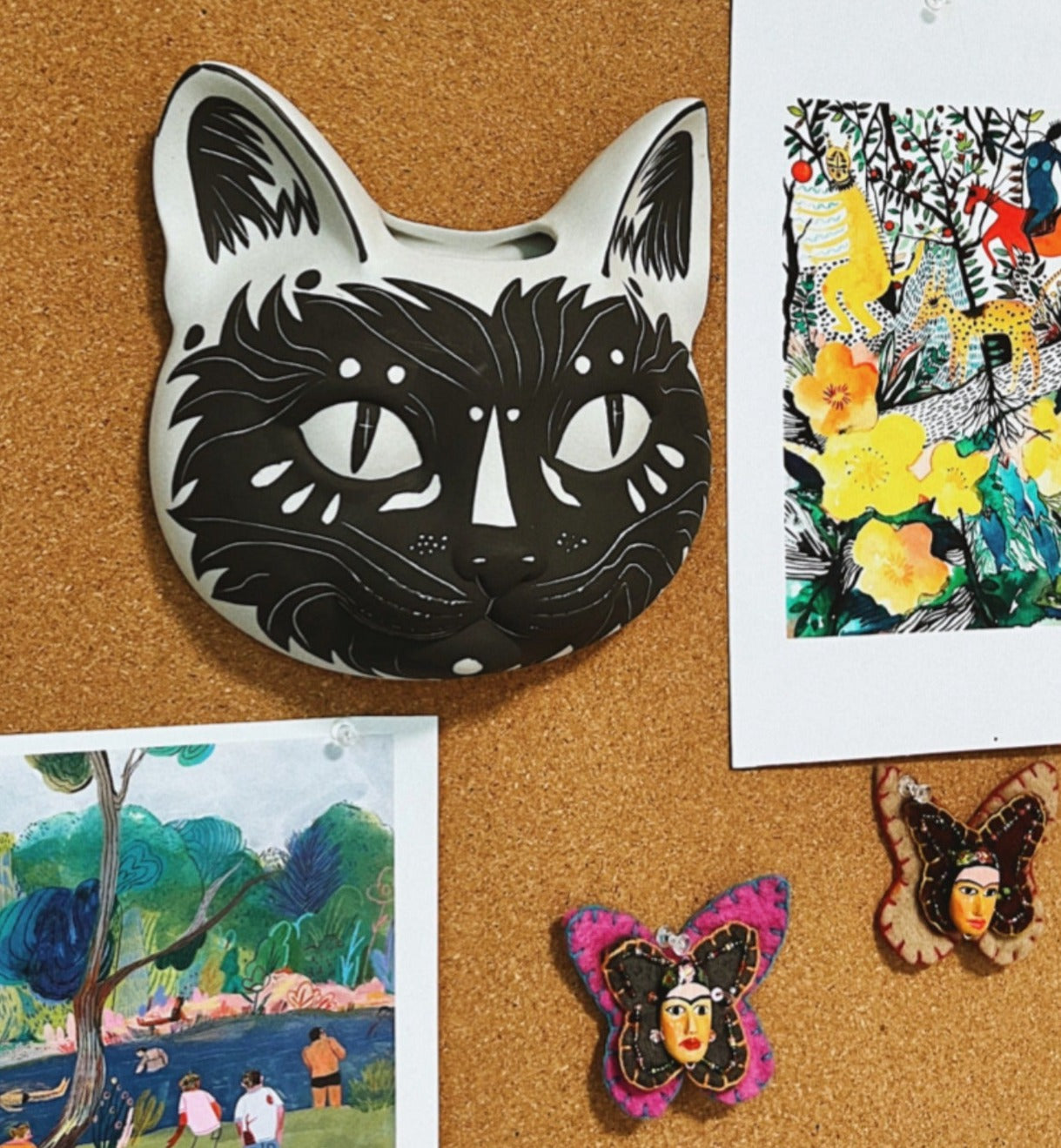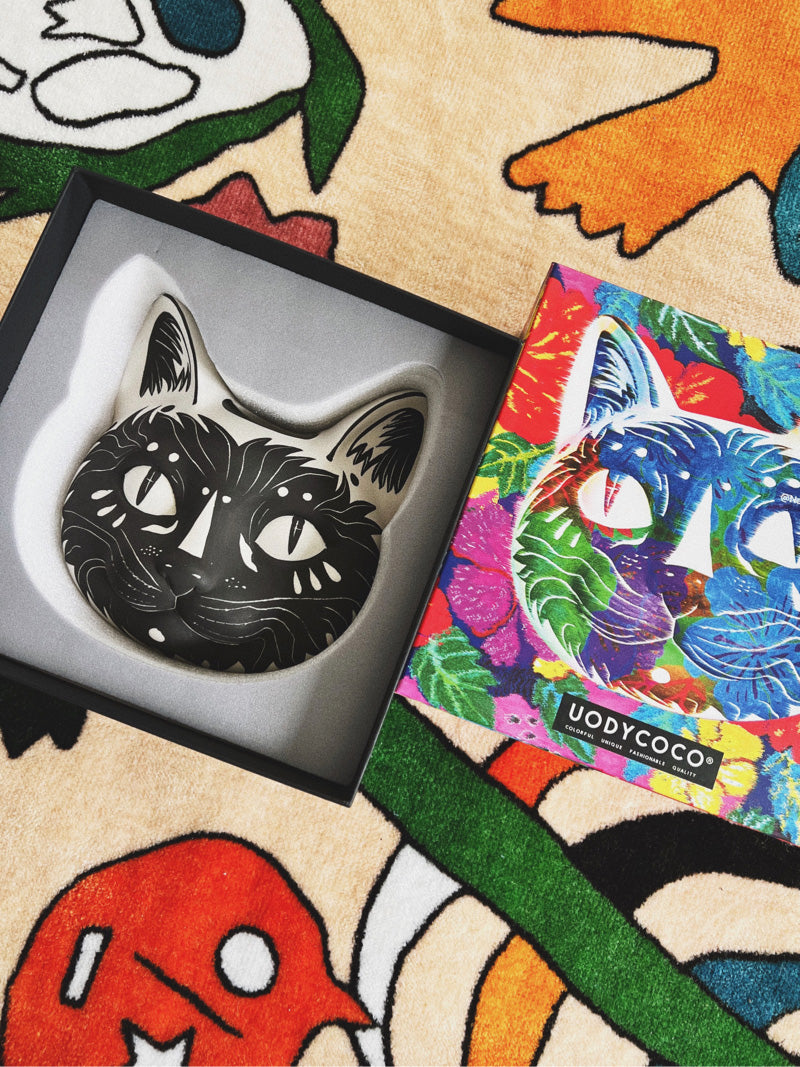 Ceramic hanging vase in cat head sculpted shape, black ink hand painted by artist